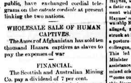 The Ameer of Afghanistan has sold ten thousand Hazara captives as slaves to pay the expenses of war.